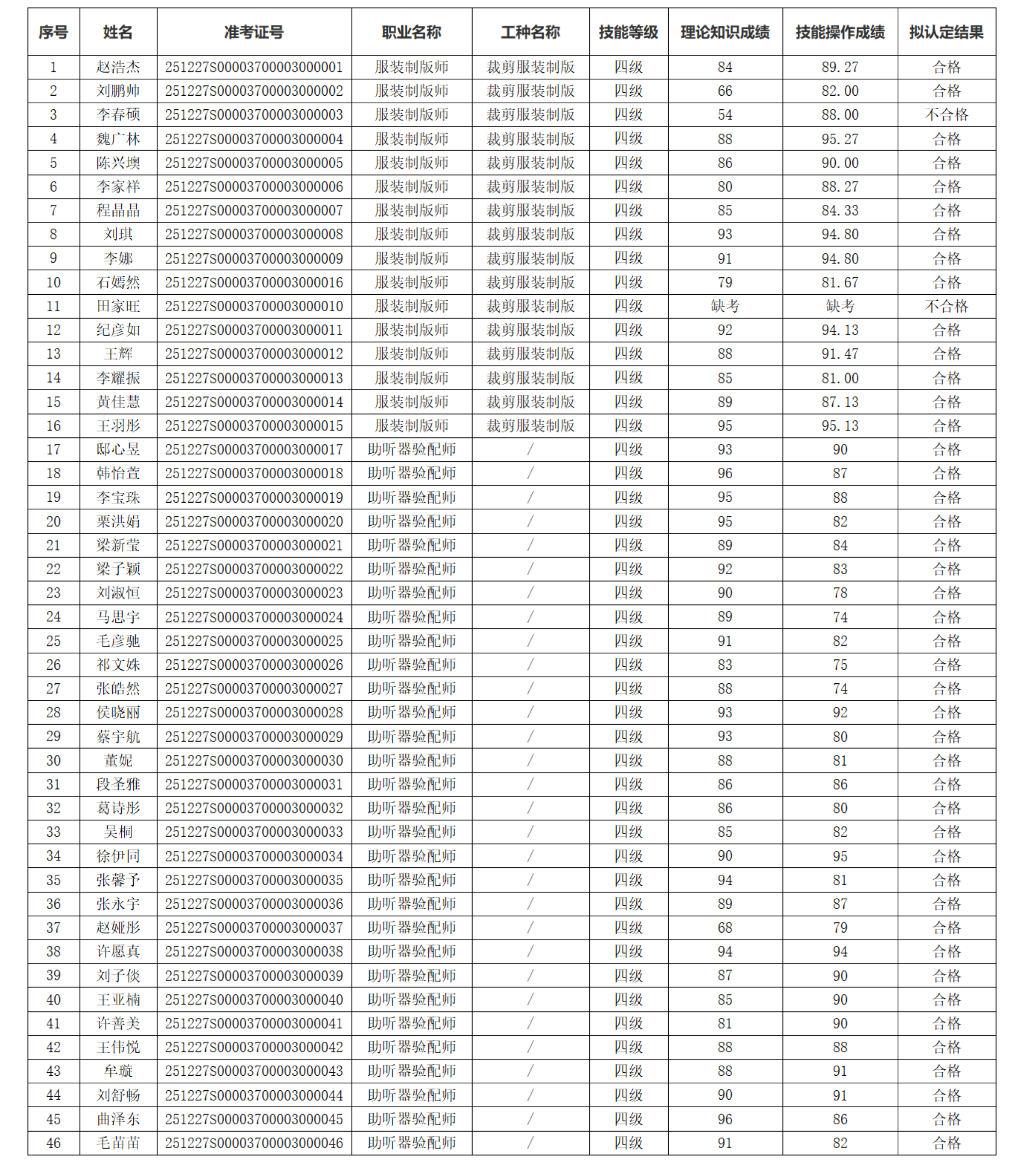 我院于2025年12月27日-28日组织开展了助听器验配师和服装制版师(裁剪服装制版)四级的职业技能等级认定,理论知识和技能操作评价工作已完成,现将认定成绩予以公示。