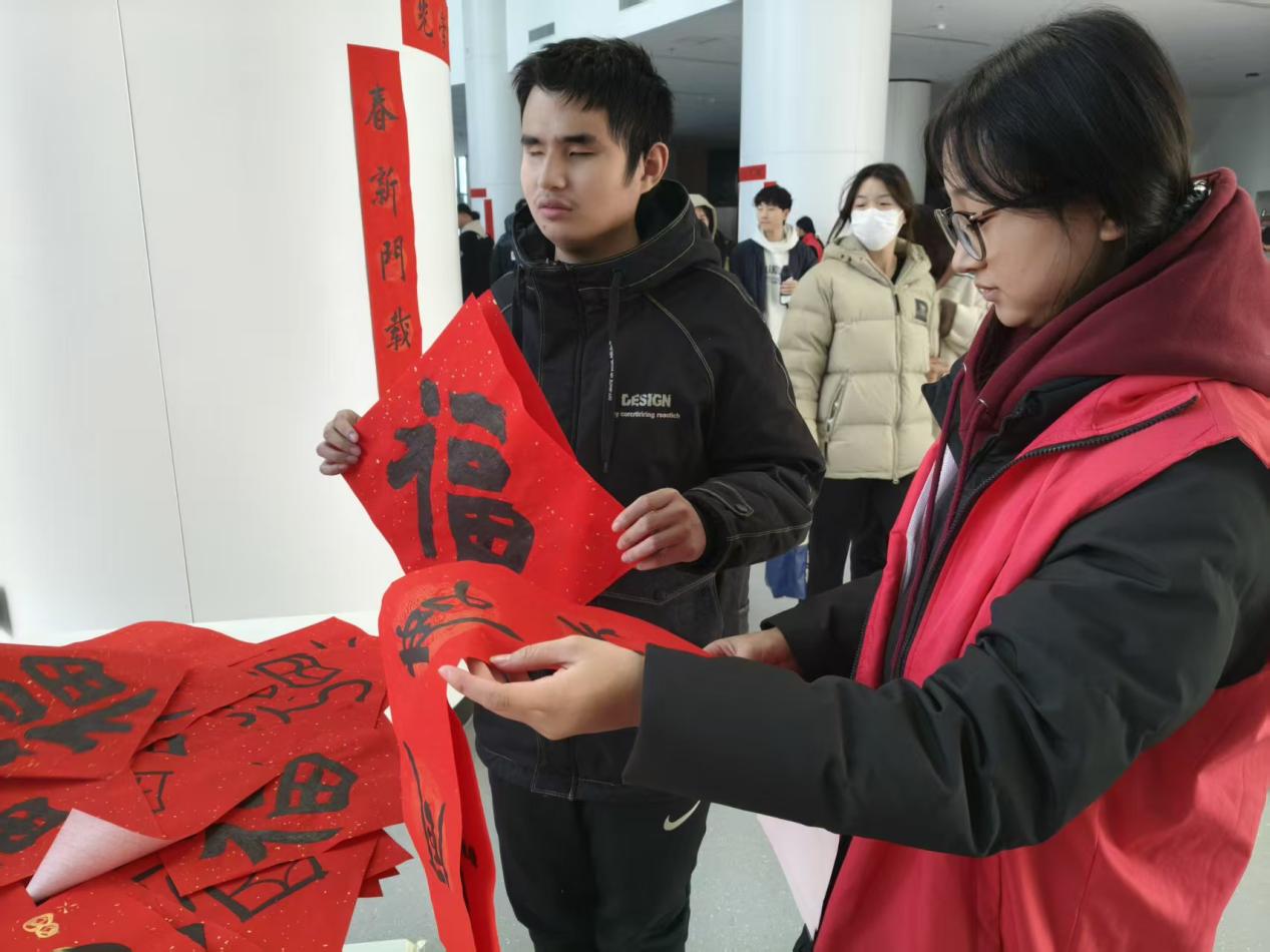 活动现场设立专属“祝福站”,为特殊学生群体提供贴心帮扶。听障学生手语编排祝福、现场展示,视障学生录制新年祝福、一展歌喉,即可兑换福礼。志愿者全程一对一协助,让每一位参与者都能感受温暖与喜悦。摄影组全程跟进拍摄,定格下笔墨创作的精彩瞬间与师生领福的喜悦笑颜。
