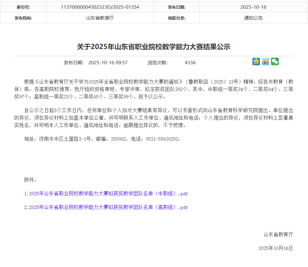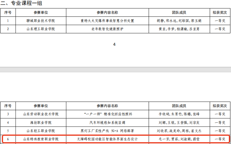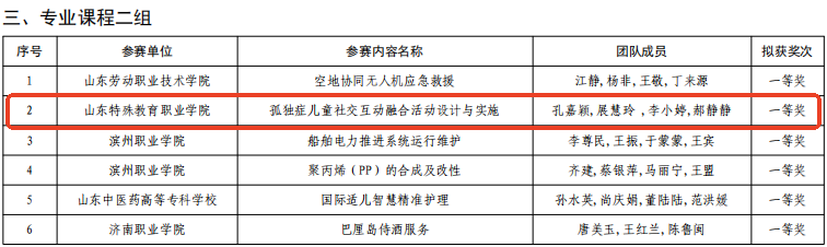 10月16日,山东省教育厅公示2025年山东省职业院校教学能力大赛获奖名单,学院信息技术系教学团队作品《无障碍校园功能区智能体界面生态设计》、特殊教育系教学团队作品《孤独症儿童社交互动融合活动设计与实施》分别荣获专业课程一组、专业课程二组一等奖。这是继2024年学院获省赛一等奖后,在同类赛事中的再次突破。