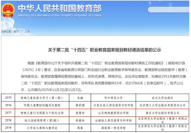 近日,教育部职业教育与成人教育司公示的第二批“十四五”职业教育国家规划教材遴选结果正式发布,我院特殊教育系教师展慧玲主编的《特殊儿童行为观察与个别化支持》教材成功入选,这是我院在特殊教育专业教材建设领域的又一重要突破,为特殊教育人才培养与行业发展提供了优质教学资源支撑。