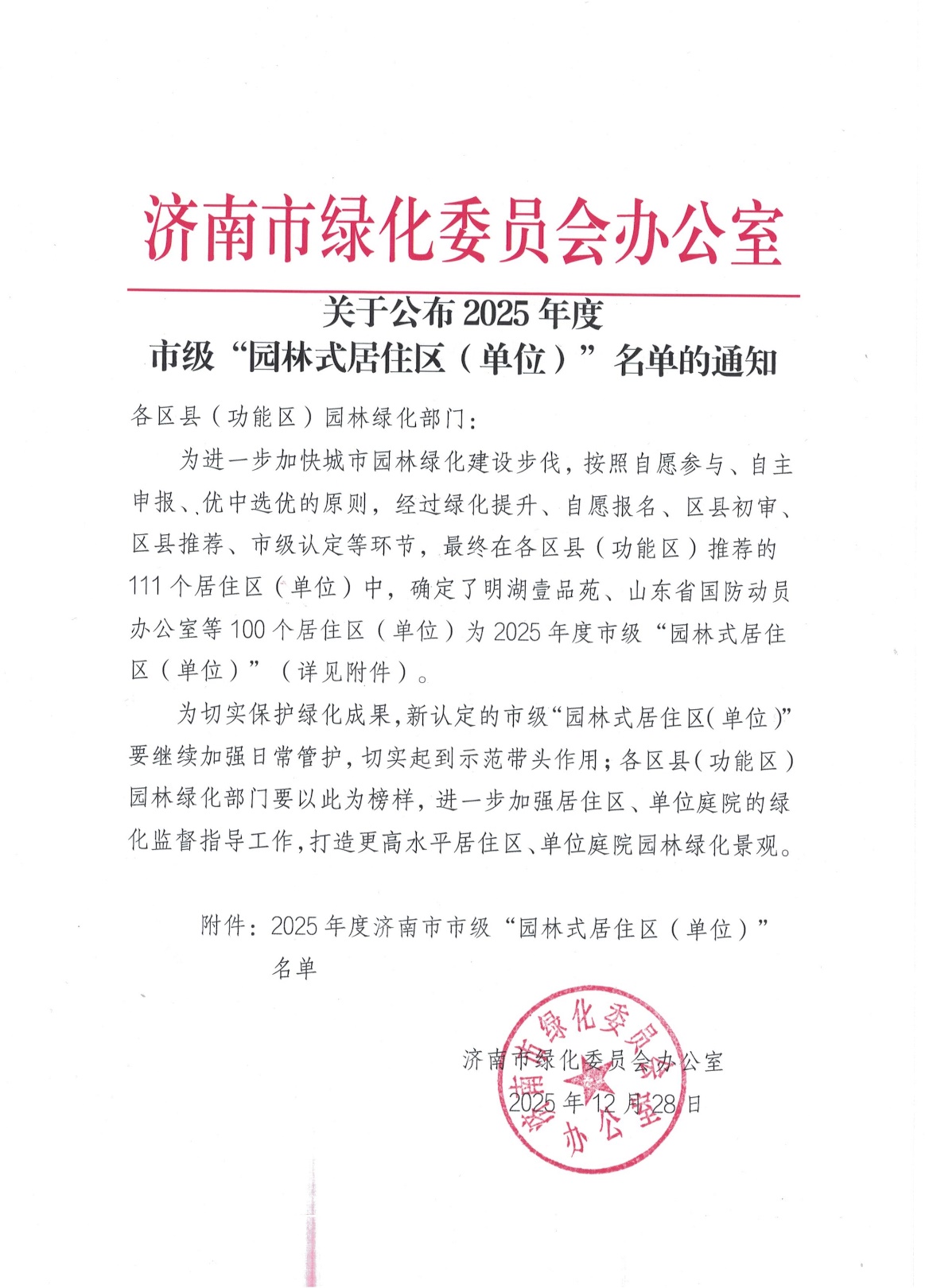 近日,济南市绿化委员会办公室印发《关于公布 2025 年市级 “园林式居住区(单位)” 名单的通知》,经区县初评、市级复核等严格评审程序,学院成功获评 2025 年度市级 “园林式居住区(单位)”。这一荣誉是对学院生态文明建设成果的高度认可,彰显了学院在践行绿色发展理念、打造生态育人环境方面的示范引领作用。