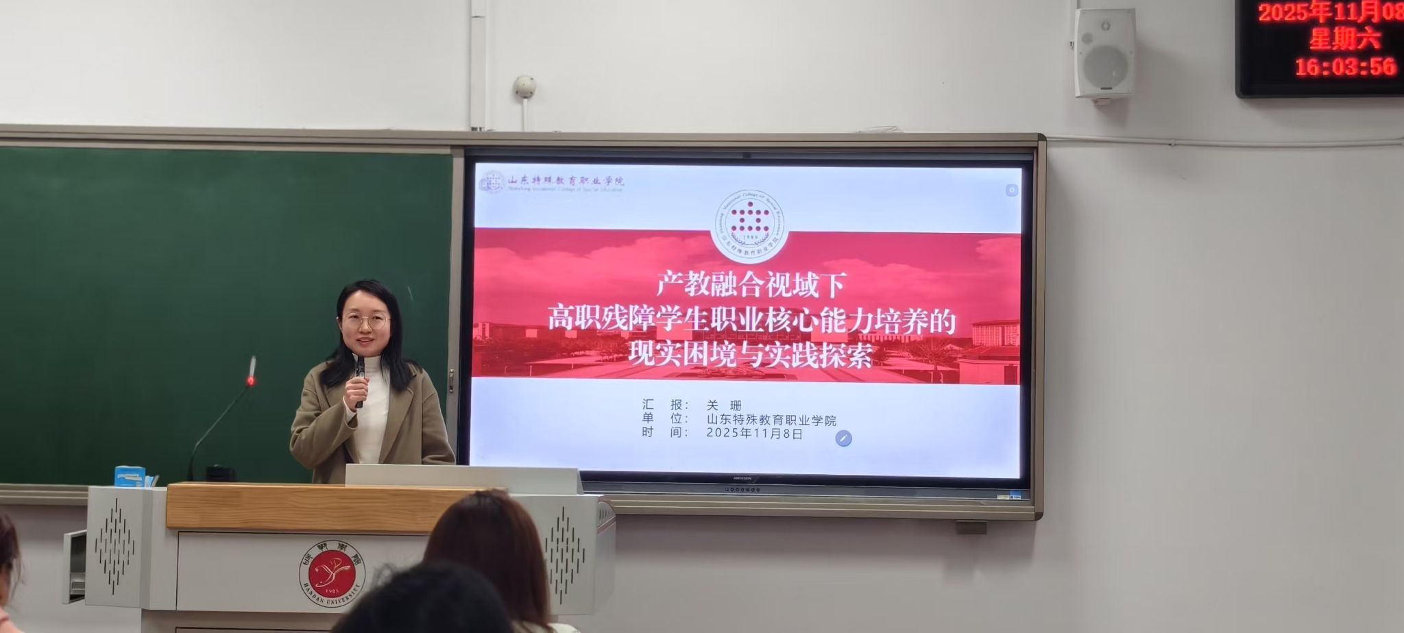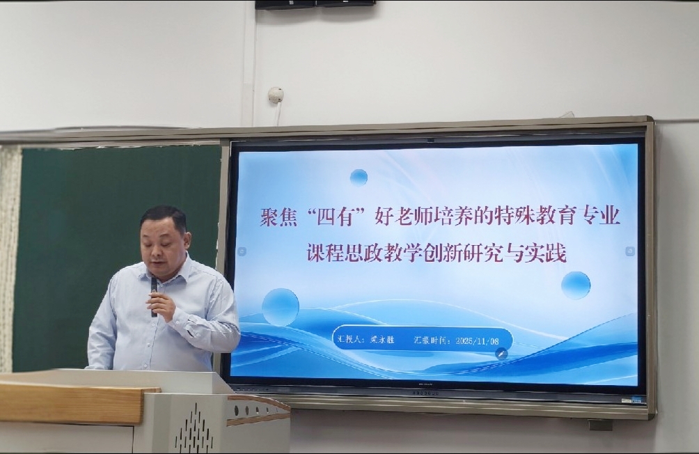 山东特殊教育职业学院特殊教育系主任梁永胜受邀作主题报告,以《聚焦“四有”好老师培养的特殊教育专业课程思政教学创新研究与实践》为题,分享学院在课程思政与特教专业融合育人方面的探索成果,引发与会者广泛关注与热烈反响。