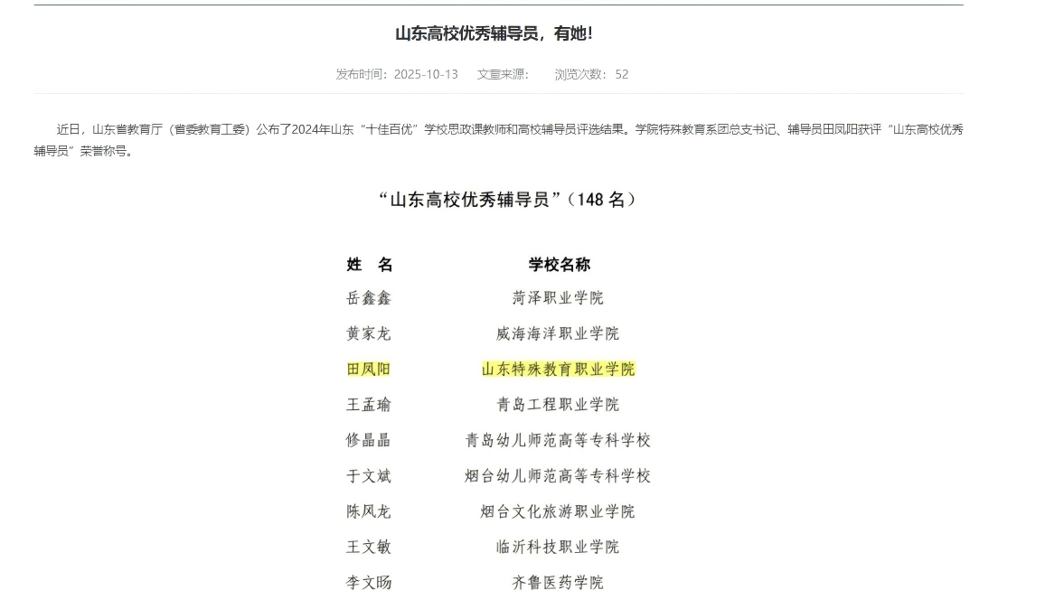 系部辅导员田凤阳凭借扎实的工作作风、创新的育人方法和突出的工作成效,取得优异成绩,当选2025年度山东高校优秀辅导员”荣誉称号。