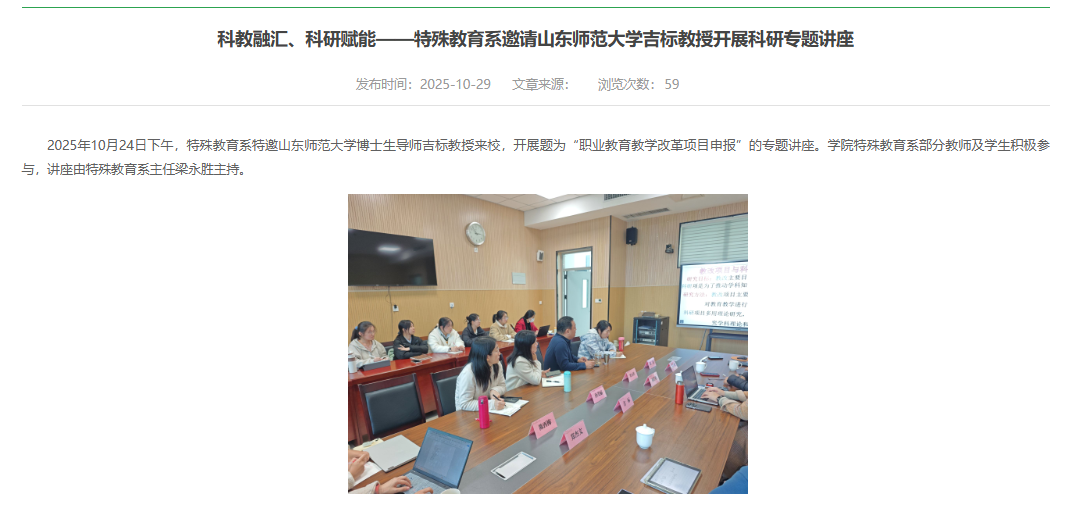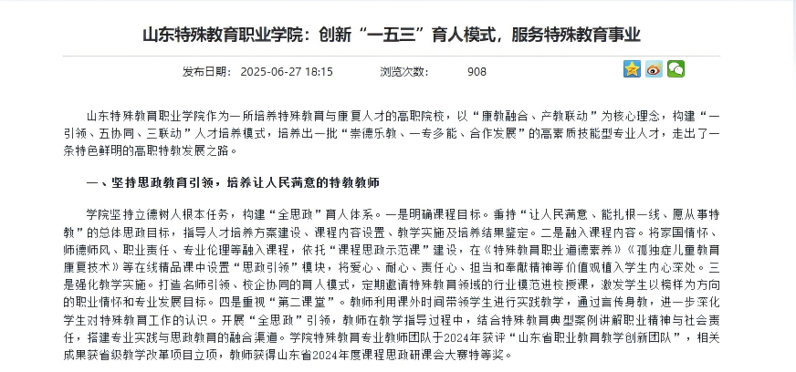 系部办学成果获得上级主管部门与权威媒体高度认可。山东省教育厅(省委教育工委)刊发专题文章“山东特殊教育职业学院:创新‘一五三’育人模式,服务特殊教育事业”;