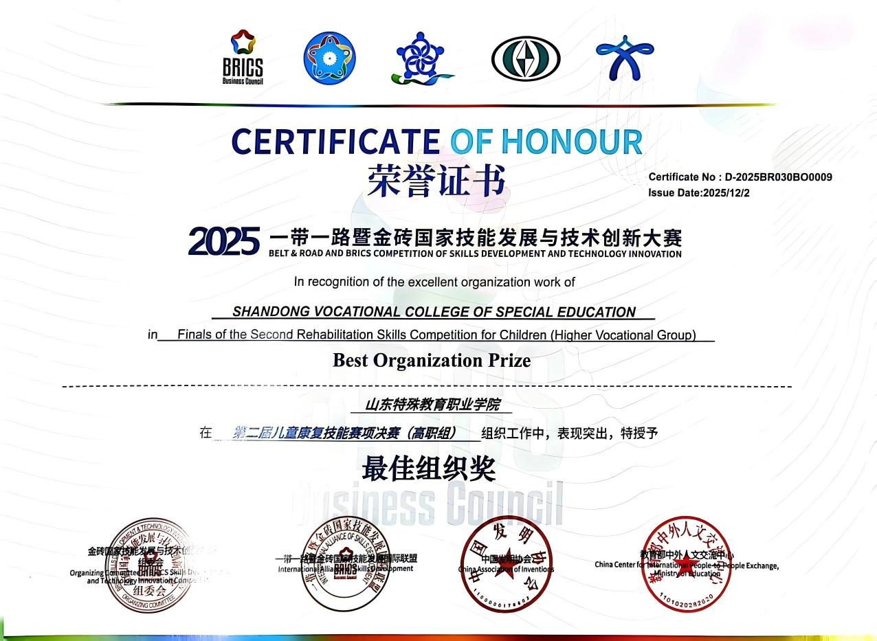 2.学生大赛:“2025“一带一路”暨金砖国家技能发展与技术创新大赛“儿童康复技能赛项”中,学子在国际舞台展现过硬专业素养,取得1金1银1铜优异成绩;在山东省第三届残疾儿童康复技能大赛暨第二届高校特殊教育康复技能大赛中,4名同学获一等奖、5名同学获二等奖;在第十三届山东省师范类高校学生从业技能大赛,获二等奖1项,三等奖2项。