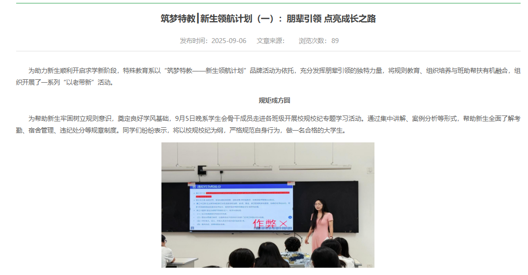 围绕2025级新生培养,系部创新开展“筑梦特教·新生领航计划”系列活动:通过“朋辈引领”帮助新生适应校园生活,“师长寄望”开展职业生涯启蒙,“薪火相传”邀请行业专家坚定职业理想;同时联动社区、特教学校开展党建共建、送教上门等活动,以“融爱润心”的育人理念,助力学生成长为有温度、有情怀、有担当的特教从业者。