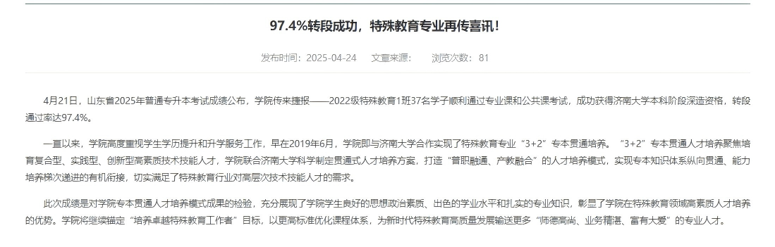 2025年4月,专升本考试传来捷报:2022级特殊教育专业37名学生通过转段考试,转段成功率达97.4%;43名报考本科院校的学生中26人成功录取,录取率达60%,两项数据均创历史新高。