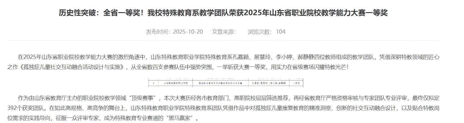 特殊教育系展慧玲、孔嘉颖、郝静静、李小婷团队在2025年山东省职业院校教学能力大赛中力克群雄,斩获全省一等奖,实现历史性突破。