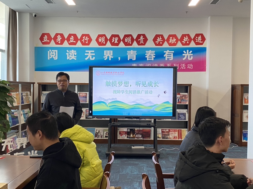 为丰富视障学生精神文化生活,鼓励他们以多元方式感知世界、勇敢追梦,12月11日下午,我院图书馆成功举办了“触摸梦想,听见成长”视障学生阅读推广活动。活动通过触摸与聆听的双重体验,为视障学生搭建了一座通往知识、梦想与成长的桥梁。